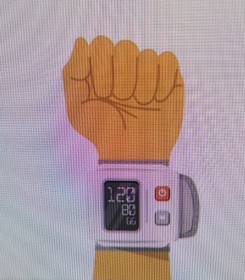 손목에 부착된 센서를 통해 혈압을 측정하고, 결과를 디지털 디스플레이에 표시합니다.